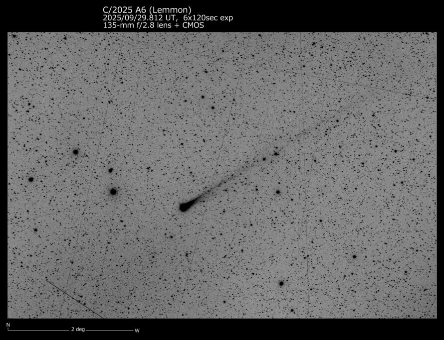 C/2025 A6 (Lemmon) 2025.09.30 2025.09.30 04:21:31~ 120sec_6exp,135-mm f/2.0 Samyang lens (絞り2.8) + CMOS(QHY268M), MPC Code: P87.縦位置の中央部を横にトリミングしてます。
