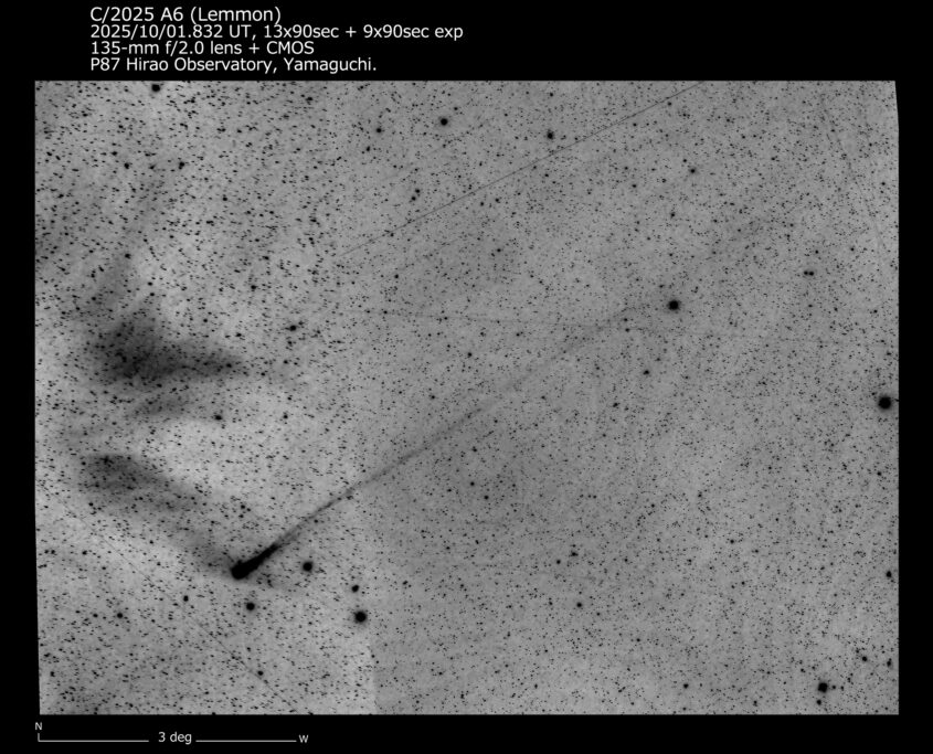 縦位置の中央部を横にトリミングし、2画像をモザイク合成しています。最低でも9度の淡い尾が伸びています。