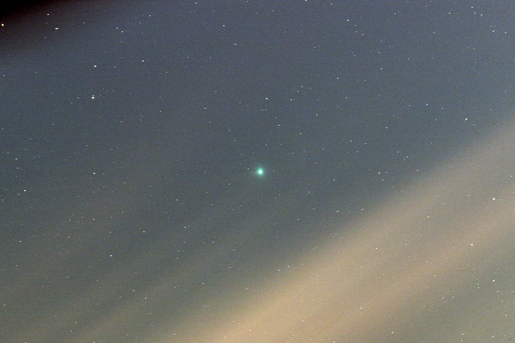 C/2025 R2(SWAN) 2025.10.05 2025.10.05 18h46m 15sec_16exp ISO800 D810A 690mmF6.5(AL-106Ⅱ) Lodestar+PHD2 Losmandy G11 周南市★少しずつ高度は上がっていますが、まだまだ低いです。撮影開始時の高度は11.9度。絶えず薄い雲が通過する状況だったにもかかわらず東(左)方向に尾が伸びているのが分かります。雲がなければもう少しはっきり写せると思います。