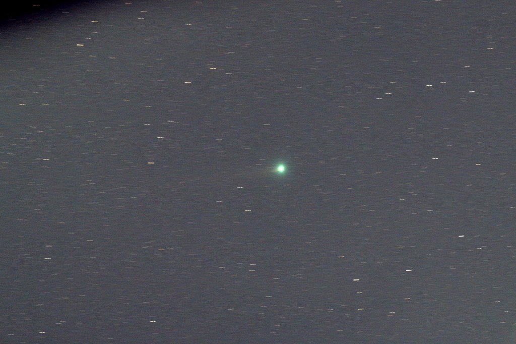 ★この彗星のいる方角は電柱やら電線やら樹木やら、何かと障害物が多く、いつもその隙間を縫っての撮影です。いちばん困るのが目の前の電線。左上から右肩下がりに張られていて、南西方向の星の日周運動のラインとほぼ重なっているのです。ひとたびこの電線が画角内(1.9°×2.8°)に入ると、出ていくまでにおよそ40分を要します。夕空の低空で限られた時間しか撮影できないのに40分もムダにするわけにはいきませんから、多少のことは許容します。画面左上の黒い影がその例です。