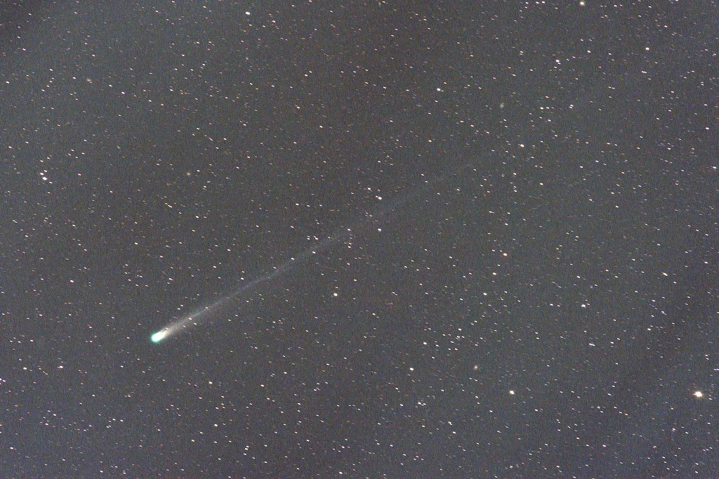 ★今朝は常設機材での撮影はあきらめ、自宅そばの空き地にスカイメモをセットして撮影しました。200mm/F4望遠レンズは銀塩時代から使い続けている骨董品です。切れ味では最新のレンズとは勝負になりませんが、一段絞れば自分的には容認できます。いまこの彗星がいる辺りは地上光がいちばん少ない方向なのが幸いしてか、案外尾が長く写りました。200mmの画角は対角で12.3度。尾は画角外にもまだ伸びていそうなので、月明かりがもう少し弱まったら市街地を脱出して撮ってみたいです。