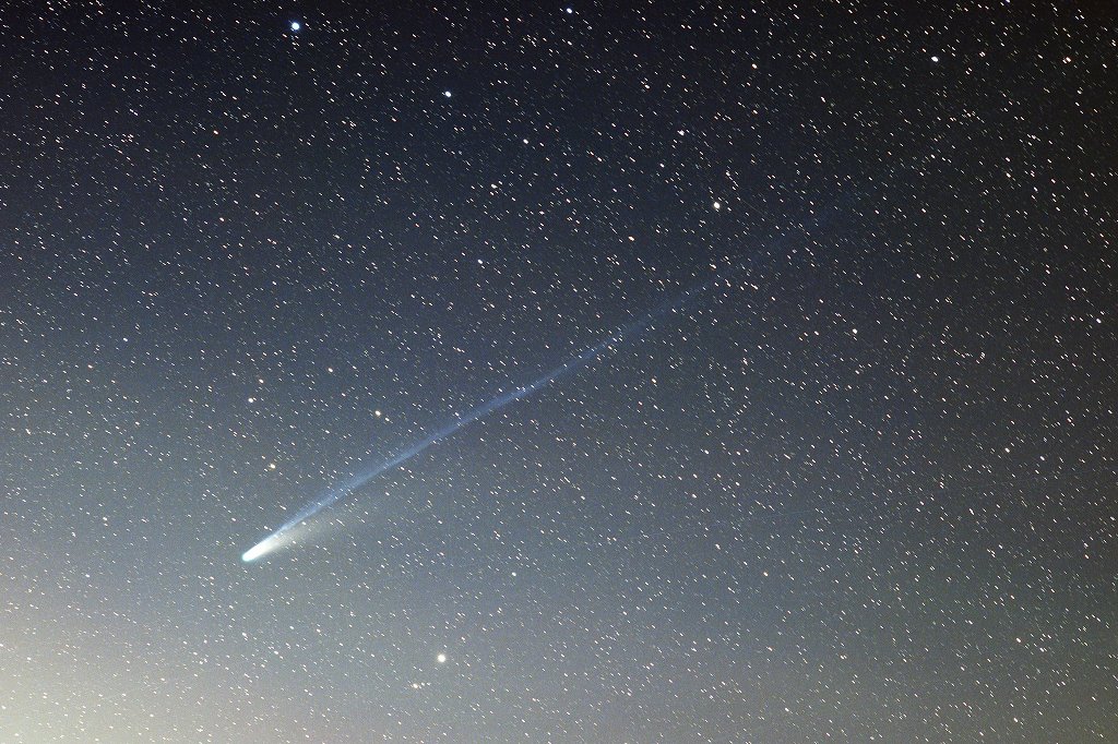 C/2025 A6(Lemmon) 2025.10.23 2025.10.23 18h39m 120sec_9exp ISO800 D810A 105mmF2.5→F5.6 SKYMEMO-P- 阿武町西台★尾がどこまで伸びているか見るため、まずは軽めの105mm望遠レンズで撮影開始。105mmの画角は対角で23.2°。この画像では15°ぐらい確認できます。尾の方向を対角に合わせたため、北が上の構図とはなっていません。