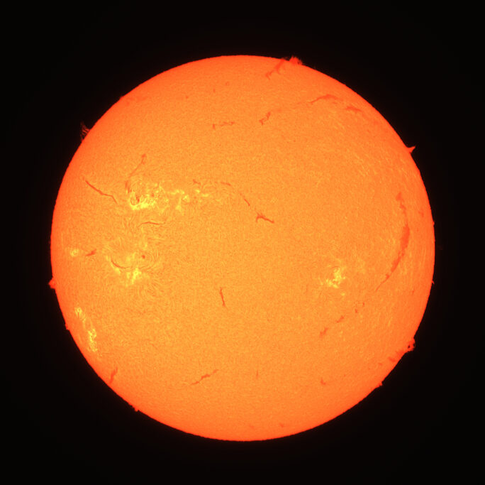2025.11.07 太陽 2025.11.07 08h20m ACUTER フェニックス(400㎜) ZWO ASI 585MC SkyWatcher SolarQuest (トリミング) プロミネンスは小さかったですが、プラージュとフィラメントで賑やかな太陽だったので久しぶりに撮影してみました。
