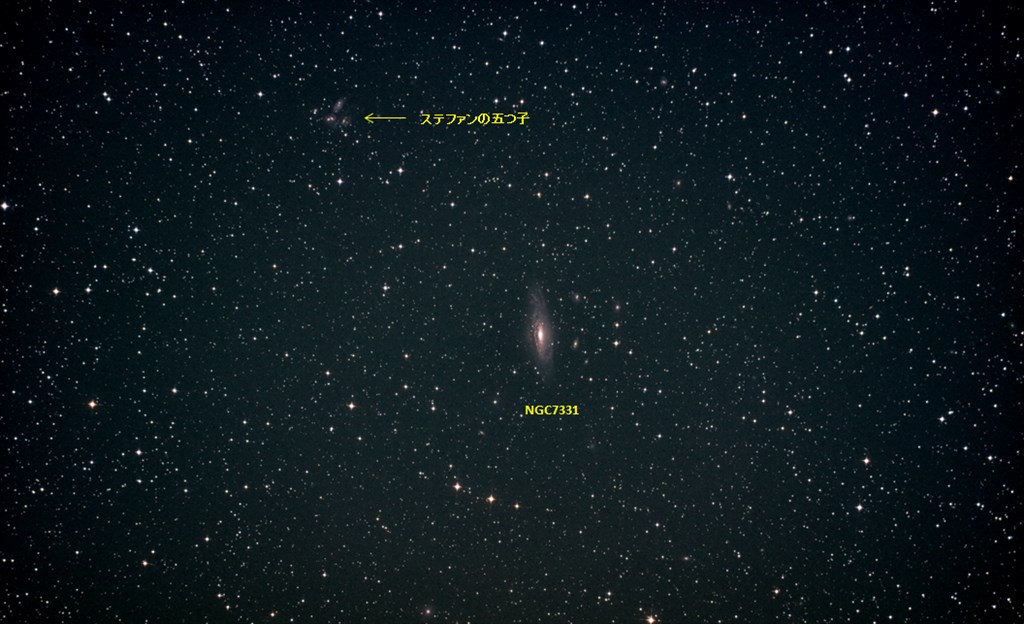 NGC7331とステファンの五つ子 2025.11.22 2025年11月22日 19h33m 120sec × 20exp ISO6400 MT160+レディユーサー(775㎜ F4.8) EM200 PENTAX K70 皇座山本命のステファンの五つ子よりも、位置の目印としたNGC7331の方が目立ってしまいました。(トリミングあり。 何倍相当かわかりません。w)