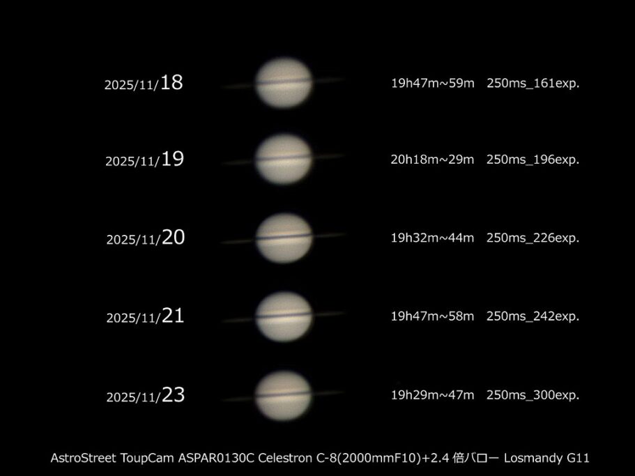 土星 2025.11.18~23 ★11月24日に環の傾きが最小になるので、観察するのを楽しみにしていたのですが、あいにくの曇り空。肝心の日の写真がありませんが、直近の画像を並べてみました。このぐらいの期間でこんな低解像度の画像では、目に見えるような変化は認められませんね。