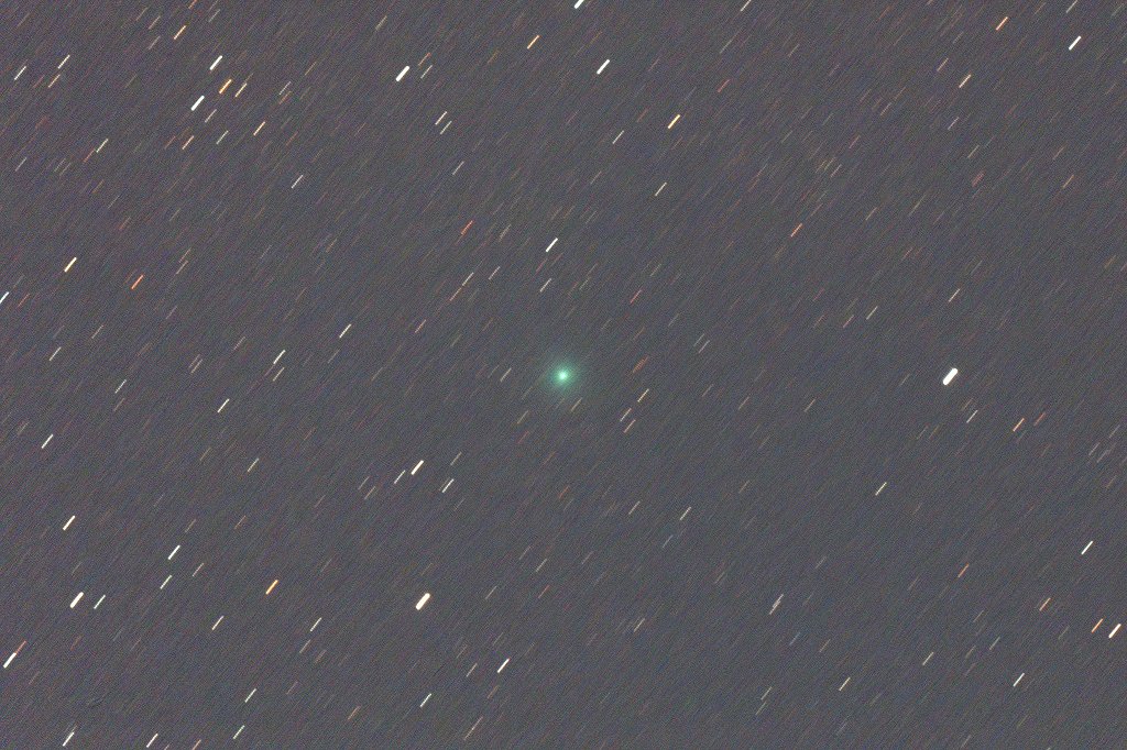 C/2025 T1(ATLAS) 2025.12.05 2025.12.05 19h30m 120sec_8exp ISO3200 D810A 1800mmF10(Mirage-7) LPS-P2 Lodestar+PHD2 Losmandy G11 周南市★「初めまして」の彗星です。現在の位置は、光害地でも見える夏の大三角(特にアルタイル)が目印になりますから、居場所の目星はつけやすいです。日が暮れてからの高度もじゅうぶんあるのですが、今夜はオートガイダーのケーブルトラブルに見舞われ、撮影開始時には高度が20度まで下がっていました。