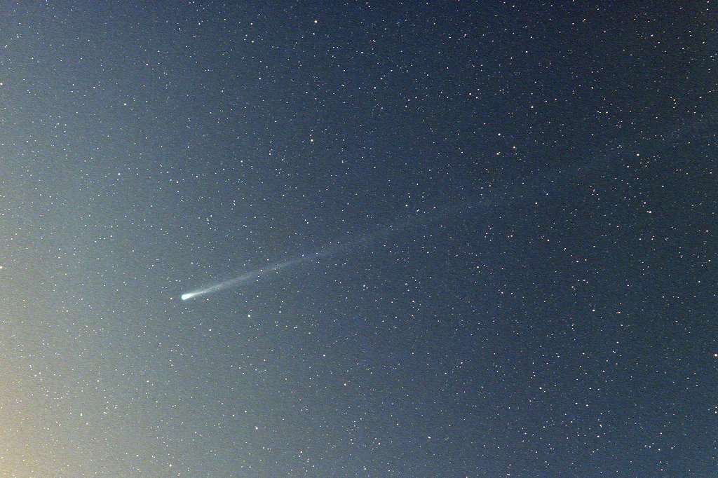 C/2025 R3(PANSTARRS) 2026.04.16 2026.04.16 04h32m 20sec_25exp ISO1600 D810A 200mmF4→F5.6 SKYMEMO-P- 周南市★常設機材では東の低空の視界が確保できませんので、スカイメモを担いで自宅東隣りの空き地まで約30メートル出張して撮影しました。本格的な遠征も考えて午前2時半には起きたのですが、昨夜の晩酌からまだじゅうぶんな時間が経過していないことに気付き、近所で撮ることにした次第。周囲は明るいですが、どうせ薄明が進めば街明かりも無害になるというものです。画像処理すると尾がフレームをはみ出すほど伸びていて予想外でした。画面内だけで約8度です。